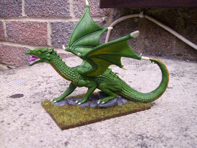 It will serve as a normal dragon in combined Wood Elf/Bretonnian army this week (my only summoned monster) and it will also go into permanent reserve should either army ever manage to cast Transformation of Kadon. Finally, the eagle rider I did last month conveniently fits on the neck and so I've now also got a Forest Dragon for my Wood Elves.