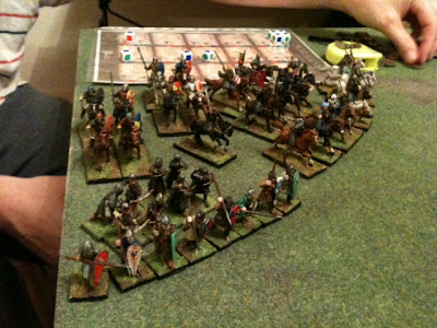 Kelly's Normans. Warlord, 2 units of 4 Knights, 2 units of 8 Mounted Sergeants, 1 unit of 8 Crossbows and 1 unit of 8 Foot Sergeants. These models were borrowed from Tom, but Kelly is building a Warband of this composition in time for the tournament and this was his first outing with them. I thoroughly expected these to come thundering down the flank towards me as I was the nearest target and a large building 'blocked' the route to Andrew's force. Which leads me to...